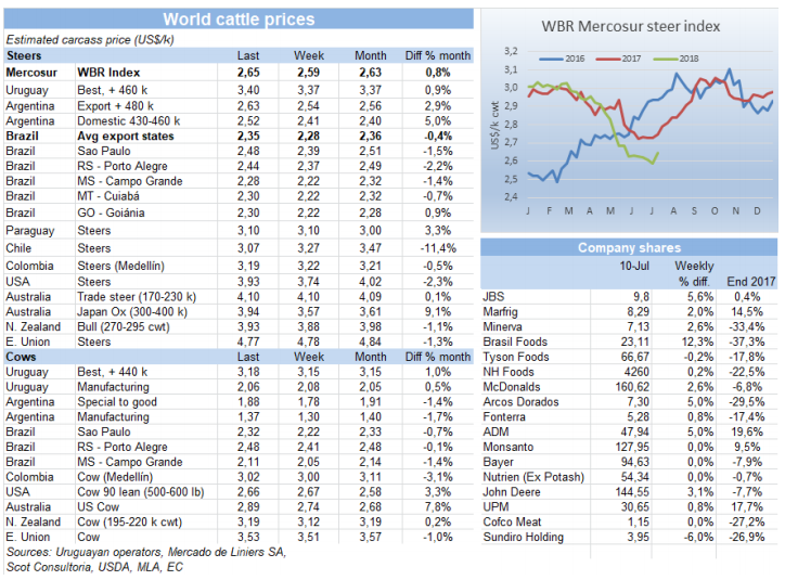 本周南方共同市場(chǎng)閹牛價(jià)格復(fù)蘇,主要原因除了各國(guó)貨幣增值,還包括活牛市場(chǎng)的穩(wěn)定,本周從2.59美金/公斤漲到2.65。本周巴西雷亞爾增值2.7%,阿根廷比索增值3.3%,此外巴西平均牛價(jià)增長(zhǎng)了0.5%到134.1雷亞爾,因此巴西育肥牛價(jià)格漲了7美分到2.35美金,阿根廷本地牛價(jià)保持穩(wěn)定,但貨幣增值導(dǎo)致美金價(jià)漲了9美分至2.63美金。烏拉圭牧場(chǎng)的活牛供應(yīng)非常短缺,由于481配額的原因需求也在增加,所以價(jià)格呈上漲趨勢(shì),巴拉圭活牛價(jià)格本周沒(méi)有變化。