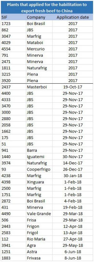 巴西十月前三周出口了9.5萬噸牛肉,均價3938美金/噸,保持這個頻率的話,十月總共會發(fā)運14.5萬噸,接近九月份創(chuàng)下的15萬噸的記錄。前九個月出口64.4萬頭活牛,同比增加60.8%。目前38家巴西牛肉工廠申請中國證,其中10家會被優(yōu)先開放,另外28家需等待第二批。由于中美貿(mào)易戰(zhàn),中國政府希望開放其他貨源來彌補美國貨源的損失,所以開放廠家的速度可能會加快。以下是申請中國證的廠家名單,前十家會優(yōu)先開放: