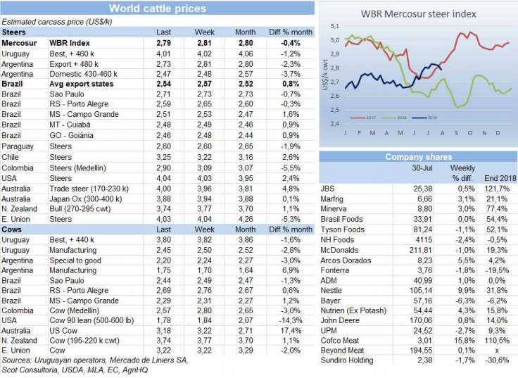 本周育肥閹牛價(jià)格小幅下跌,有些地區(qū)活牛供應(yīng)充足,工廠有足夠的條件壓價(jià),圣保羅州育肥閹牛價(jià)格跌了0.5雷亞爾到154.5雷亞爾/15公斤,帶骨牛肉批發(fā)市場(chǎng)價(jià)格跌到9.72雷亞爾/公斤,七月累計(jì)下跌5.2%。