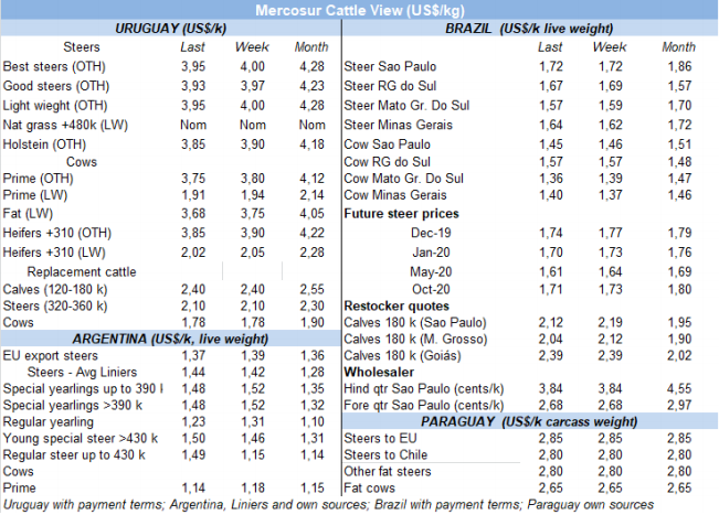 南方共同市場(chǎng)閹牛價(jià)格再次下跌3美分,胴體價(jià)格下降至3.07美元/公斤,四周以來(lái)連續(xù)下跌16美分。盡管巴西上周育成牛價(jià)格保持穩(wěn)定趨勢(shì),在主要的出口州凈差額再次下跌2雷亞爾,下跌至184.5雷亞爾/15公斤。按美元算價(jià)格下跌4美分下跌至3.02美元/公斤。烏拉圭閹牛價(jià)格也在下跌,參考價(jià)格自9月上半月15周以來(lái)首次跌破4美元/公斤。巴拉圭和阿根廷參考價(jià)格的變化很小,巴拉圭育成牛胴體價(jià)格連續(xù)第五周保持2.8美元/公斤,阿根廷參考價(jià)下跌2美分,下跌至2.78美元/公斤。