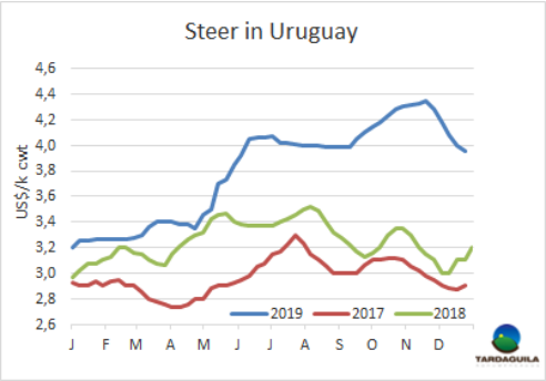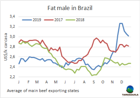 烏拉圭工廠也關(guān)注到中國(guó)市場(chǎng)的下行。巴西現(xiàn)在開(kāi)始將部分出口供應(yīng)轉(zhuǎn)向巴拉圭的關(guān)鍵市場(chǎng),如智利和俄羅斯。智利圣地亞哥1月裝船的巴拉圭全牛20件套5300美元/噸,俄羅斯市場(chǎng)肩胛背肩上周從4100美元/噸下降到3800每元/噸。據(jù)一位業(yè)內(nèi)人士稱(chēng),后部位肉巴拉圭工廠售價(jià)不超過(guò)4300美元/噸,“競(jìng)爭(zhēng)不容易,現(xiàn)在我們還要與活牛價(jià)格走低的巴西競(jìng)爭(zhēng)?!?span>