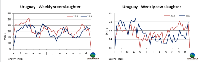上周巴西牛肉價(jià)格和活牛價(jià)格均表現(xiàn)穩(wěn)定,圣保羅育成牛價(jià)格30天內(nèi)參考價(jià)格穩(wěn)定在202雷亞爾/15公斤,一些地區(qū)表現(xiàn)出下行的周修正趨勢(shì),另一些地區(qū)則有上漲。盡管像JBS上周宣布的那樣,今年年末和明年年初屠宰活動(dòng)頻繁的工廠將減少,活牛價(jià)格依然保持穩(wěn)定。本周期貨市場(chǎng)價(jià)格有下行趨勢(shì),12月合同育成牛價(jià)格高于當(dāng)前參考價(jià)。上周批發(fā)市場(chǎng)牛肉價(jià)格穩(wěn)定,后部位肉需求松動(dòng),與11月末達(dá)到的最高價(jià)相比,后部位肉下跌20%,前部位肉價(jià)格下跌14%。烏拉圭