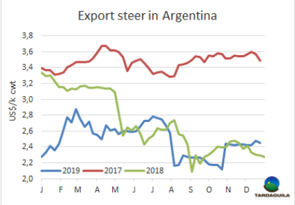 盡管費(fèi)爾南德斯政府加征出口稅整體上沒(méi)有帶來(lái)明確的影響,但是已經(jīng)表露出一些跡象。目前,實(shí)際出口稅率的增長(zhǎng)幾乎翻了一番,因?yàn)榘幢人骼U納實(shí)際出口稅相當(dāng)于4.8%的稅率,而通過(guò)法令廢除按比索繳納的出口稅后,實(shí)際匯率上升到9%。最后經(jīng)濟(jì)緊急狀態(tài)法將授權(quán)將出口稅提高到15%,暫未頒布。然而,據(jù)分析,盡管經(jīng)濟(jì)因素為肉類(lèi)行業(yè)帶來(lái)?yè)?dān)憂,但目前最緊急的是中國(guó)市場(chǎng)的情況。據(jù)畜牧專(zhuān)家稱(chēng),“出口稅總歸是不好的,它們產(chǎn)生了一定影響,但現(xiàn)在最大的問(wèn)題是中國(guó)市場(chǎng)的下行和合同的議價(jià),這比出口稅更復(fù)雜。我們要今天的批準(zhǔn)結(jié)束后看看一切結(jié)果如何,然計(jì)算損失?!?span>Cofrigo總經(jīng)理表示目前中國(guó)市場(chǎng)情況是影響最大的,因?yàn)?span>11