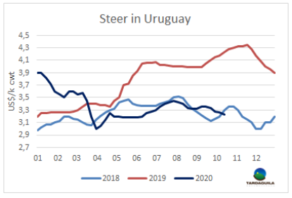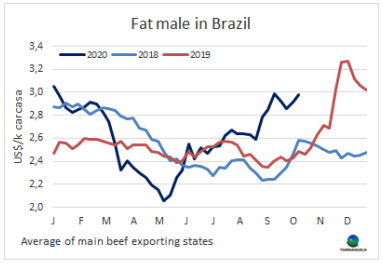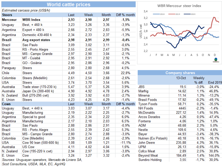 智利進(jìn)口市場表現(xiàn)出上行跡象,一位巴拉圭出口商表示,20切全牛成交價4900-5100美元/噸,11月和12月的銷售前景樂觀。