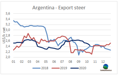 盡管阿根廷貨幣強(qiáng)勢貶值,但由于歐洲市場需求疲軟,價格下跌,出口閹牛價格下跌3比索/公斤。最好的英國純種閹牛目前成交在185-190比索/公斤。串種澤布牛參考價保持穩(wěn)定,185-188美元/噸。另一方面,中國市場是目前唯一有興趣的市場,中國需求增強(qiáng),拉動活牛價格上漲。特優(yōu)母牛價格上漲了12-15比索,上漲至170-178比索。工業(yè)母牛價格上漲了14比索,目前報價在155-160比索。