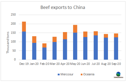 中國兩大牛肉供應(yīng)商南美和澳洲9月向中國港口直接出口的牛肉估計為14.6萬噸,略高于8月的14.4萬噸,明顯低于5月份19.5萬噸的最高出口量。南美方面,巴西出口的下降部分被烏拉圭和阿根廷抵消。雖然目前還沒有得到阿根廷和烏拉圭的出口量數(shù)據(jù),但屠宰量的增長和國內(nèi)需求的疲軟應(yīng)該會給上月的出口盈余留下更大的空間。總體而言,南美地區(qū)出口量將在12.5萬噸左右,每月增加2000噸。另一方面,澳洲方面,新西蘭的出口增加至10480噸,澳大利亞的出口減少至10 387噸。運(yùn)往中國的總出口量為20867噸,僅比8月份減少了108噸。