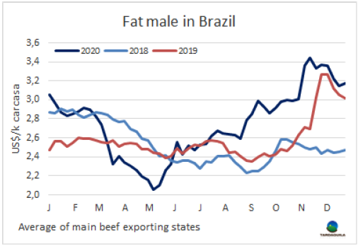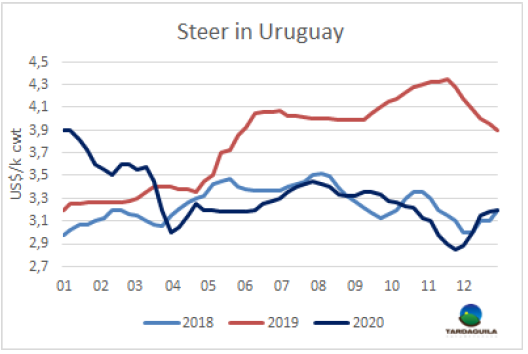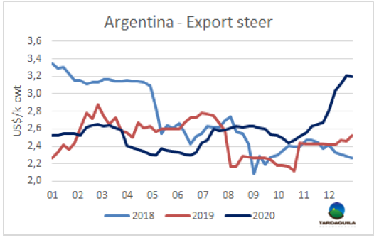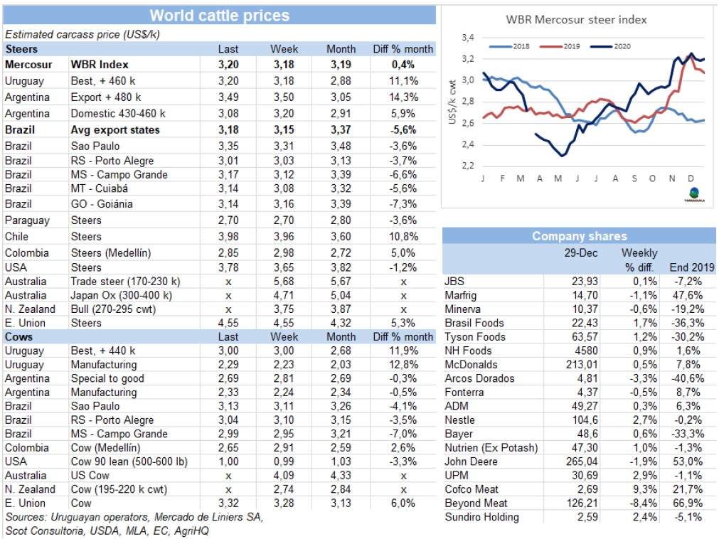 本周南方共同市場閹牛價格以上漲結(jié)束了2020年的走勢。本周價格上漲了2美分,上漲至3.28美元/公斤,較本年度價格最高點(diǎn)僅相差5美分(12月初時),較5月南美地區(qū)疫情最嚴(yán)重時牛價最低點(diǎn)高90美分(39%)。本周南美牛價指數(shù)上漲主要由于巴西和烏拉圭牛價上漲,本周巴西育成牛價格上漲了4雷亞爾,上漲至248雷亞爾/15公斤,結(jié)束了前幾周的下行趨勢,由于雷亞爾貶值,美元價格漲幅較小,美元牛價上漲了3美分至3.18美元/公斤。烏拉圭由于供應(yīng)減少,特種閹牛價格上漲了2 美分,上漲至3.2美元/公斤。阿根廷方面前幾周市場堅挺,本周趨于平穩(wěn),由于阿根廷比索貶值蓋過了本地牛價的上漲,出口閹牛價格下跌了1美分至3.49美元/公斤。巴拉圭市場活牛價格連續(xù)第三周保持平穩(wěn),保持2.7美元/公斤。