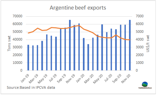 根據(jù)阿根廷牛肉推廣局發(fā)布的報告,11月冰鮮牛肉、冷凍牛肉及其加工產(chǎn)品出口量總計65757噸,達(dá)十年以來最大,出口額達(dá)2.616億美元。這些數(shù)字意味著出口量與2019年11月相比增長11.4%,出口額下降了22.6%。該差異產(chǎn)生的原因是11月平均出口價格較去年同期降低了30.5%,11月冰鮮去骨牛肉平均出口價格達(dá)近6250美元/噸。冷凍去骨牛肉平均價格4000美元/噸,同比分別下跌了22.7%和27.4%。平均出口價值自2009年以來首次降至每噸4000美元以下,達(dá)整個南美地區(qū)最低。市場分析師Ignacio Iriarte告訴記者,以同等胴體重量計算的月出口量和年出口量記錄是90多年來最高的。