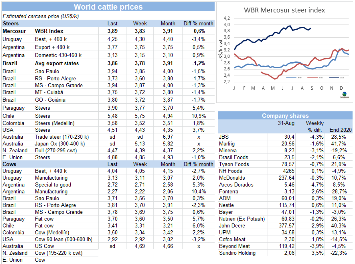 上周巴西雷亞爾增值逆轉(zhuǎn)了近幾周南美市場閹牛價格指數(shù)的下行趨勢。南方共同市場閹牛價格指數(shù)上漲6美分至3.89美元/公斤。該指數(shù)上漲的主要原因是雷亞爾增值4%。巴西主要出口州育肥牛價格上漲8美分至3.86美元/公斤,盡管本地牛價下跌了6雷亞爾/15公斤,自五月末14周以來首次跌破300雷亞爾/15公斤。巴拉圭方面的降雨使供應(yīng)端的壓力得到了緩解,最近兩周待宰牛價格上漲了20美分至3.9美元/公斤,巴拉圭牛價成為南美第二高。阿根廷出口閹牛價格上漲了2美分至3.77美元/公斤。烏拉圭牛價保持下降趨勢,參考價4.25美元/噸。