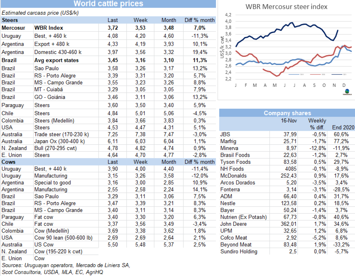 本周隨著巴西國內(nèi)市場需求對巴西育肥牛價(jià)格產(chǎn)生的積極作用,以及阿根廷和巴拉圭牛價(jià)上漲,南方共同市場閹牛價(jià)格指數(shù)反彈,較上周上漲19美分至3.72美元/公斤,達(dá)九月末以來最高。由于巴西國內(nèi)需求的改善和育肥牛供應(yīng)的減少,巴西主要出口州育肥牛價(jià)格在一周內(nèi)上漲了29美分,達(dá)3.45美元/公斤。南美地區(qū)牛價(jià)還受到阿根廷和巴拉圭的拉動(dòng),阿根廷的供不應(yīng)求導(dǎo)致活牛參考價(jià)上漲14美分至4.33美元/公斤,使阿根廷的牛價(jià)上漲至南美地區(qū)最高。巴拉圭方面對以色列的出口需求和降雨的到來使牛價(jià)從上周的下行開始有所回升,唯一一個(gè)牛價(jià)下行的國家是烏拉圭,上周由于工會(huì)罷工,草飼牛需求有所緩解,參考價(jià)約達(dá)4.08美元/公斤。