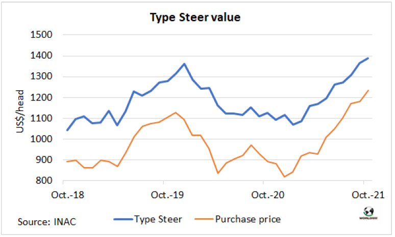 閹牛類型價(jià)值,是對牛肉工廠出售牛分割出的所有產(chǎn)品價(jià)格的加權(quán)估算,10月閹牛類型價(jià)值達(dá)歷史新高。據(jù)INAC的報(bào)告,閹牛類型價(jià)值平均1389美元,比9月增加了22美元,比去年同期增加了261美元(23%)。INAC稱這是因?yàn)椤俺隹诓课蝗夂蛧鴥?nèi)市場胴體價(jià)格的上漲”。相反,鮮皮、內(nèi)臟和副產(chǎn)品價(jià)值下降。相反,10月活牛采購價(jià)上漲了53美元/頭至1233美元/頭?;钆2少弮r(jià)與閹牛類型價(jià)值之間的差額(INAC稱之為工業(yè)增加值)本月減少了31美元至156美元,僅為閹牛類型價(jià)值的11.2%。