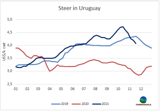 上周希爾頓臀肉出口價(jià)格急劇下跌,一系列因素給市場帶來不確定性。首先是歐洲市場對第四波疫情采取了新的管控,德國和荷蘭宣布了新的防疫限制措施,奧地利則選擇控制未接種疫苗的人口(超過30%),以遏制疫情的傳播。上周歐元走軟,人們猜測明年1月1日開放的下一個(gè)季度配額窗口會(huì)有大量481配額的牛肉進(jìn)入。盡管阿根廷方面的報(bào)盤有限,成交價(jià)達(dá)13300-13800美元/噸離岸價(jià)。最近幾天由于工會(huì)罷工屠宰活動(dòng)減少了很多。