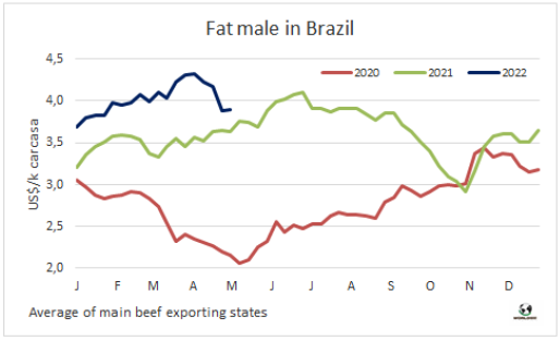 巴西育肥牛價(jià)格連續(xù)七周下跌后,市場達(dá)到了新的平衡。最近一周價(jià)格僅下跌了1雷亞爾/15公斤,主要出口州育肥牛價(jià)格參考價(jià)291雷亞爾/15公斤。需求方面,在周末母親節(jié)的額外需求的加持下,圣保羅批發(fā)市場銷售情況不錯(cuò)。草飼牛的供應(yīng)增長,給市場帶來了一些壓力,預(yù)計(jì)五月前兩周市場將保持穩(wěn)定。