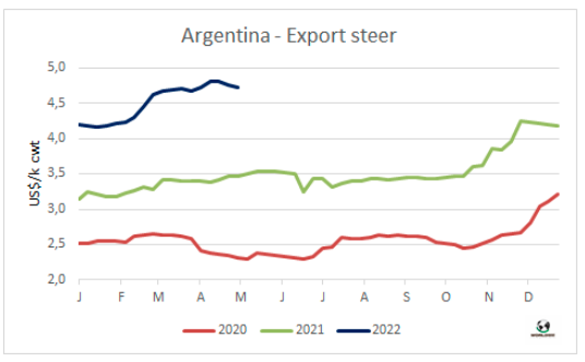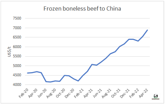 4月冰鮮牛肉對(duì)歐盟的平均出口價(jià)格達(dá)14179美元/噸,環(huán)比上漲了12%,達(dá)自2011年11月10多年以來的最高水平。這一平均價(jià)格反映了希爾頓配額內(nèi)的產(chǎn)品價(jià)格漲幅較大,而481配額內(nèi)出貨的產(chǎn)品漲幅相對(duì)緩和,占比小,平均價(jià)格較低。2022年前4個(gè)月,發(fā)往歐盟的冰鮮牛肉的平均價(jià)格為11893美元/噸,比2021年同期增長了32%。