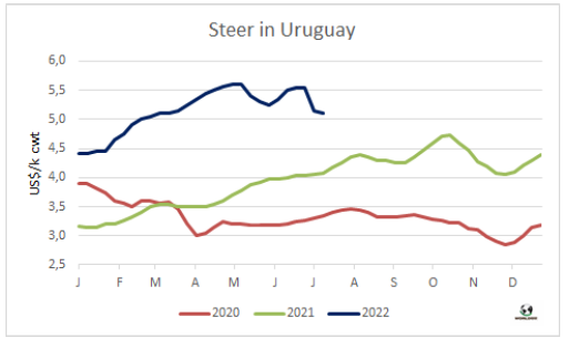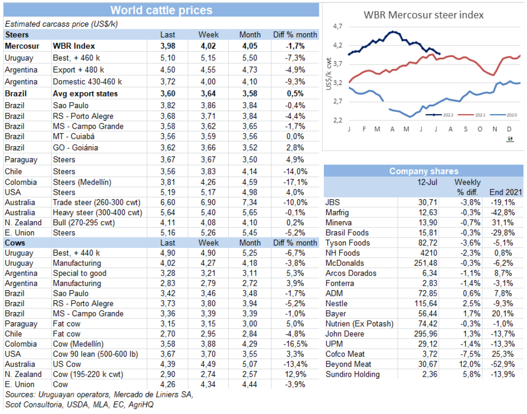 五家工廠暫停屠宰活動加上一些還在進行屠宰活動的工廠減產(chǎn),導致牛屠宰量下降至2020年末至今一年半以來的最低水平。烏拉圭肉協(xié)報告,截止7月9日,一周內(nèi)牛屠宰量29829頭,環(huán)比減少了1萬多頭,減幅約25%。同比減少了2.1萬頭,減少了42%。屠宰量較上周下降是由于閹牛屠宰量下降了約28%至14561頭,母牛屠宰量較上周下降了17%至10506頭。小母牛屠宰量下降了17%至4297頭。屠宰量最高的工廠是Las Piedras,379廠,屠宰量 5022頭, Marfrig-Cledinor,394廠,屠宰量 3180頭和Ontilcor 439廠,屠宰量3,041頭。美麗華三家屠宰場屠宰量累計6553頭,Marfrig兩家屠宰場累計屠宰量5735頭。本周烏拉圭2廠,104廠等一些上周暫停的屠宰場恢復屠宰, 12廠,344廠,310廠仍未恢復屠宰。美麗華7廠屠宰持續(xù)至昨天,將暫停屠宰直至八月中旬。本周屠宰量將繼續(xù)保持低水平,不過將較前一周的低點有所提高。