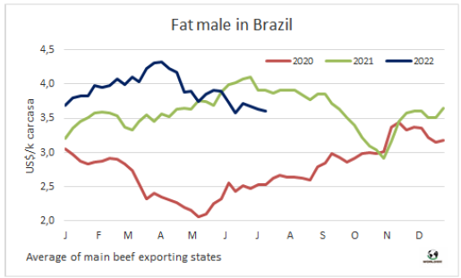 Cepea數(shù)據(jù)顯示,今年1-6月犢牛(在南馬托格羅索州出售的8-12個月)的平均體重為213.15公斤/頭。從Cepea于2000年2月開始這項調(diào)查以來的年平均數(shù)據(jù)來看,這一數(shù)據(jù)創(chuàng)歷史新高。情況表明,盡管生產(chǎn)成本很高,但巴西農(nóng)民近年來增加了改善養(yǎng)殖技術方面的投資。養(yǎng)殖的改善已經(jīng)可以通過架子牛供應的增加以及犢牛體重增長觀察到。