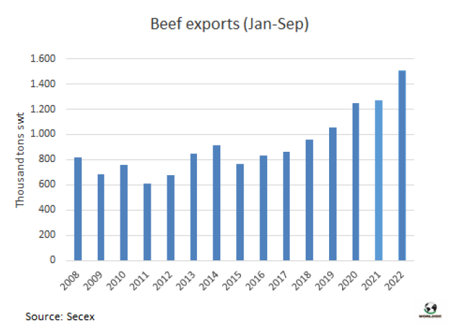 8月阿根廷對(duì)中國(guó)的出口大幅下降,為4.16萬(wàn)噸,其中8700噸是帶骨牛肉。冷凍去骨牛肉對(duì)中國(guó)出口量3.28萬(wàn)噸,環(huán)比下降20%。中國(guó)在阿根廷肉類出口中的份額從上個(gè)月的82%下降到8月份的73%。阿根廷牛肉出口商會(huì)指出:“2022年8月出口到中國(guó)的去骨牛肉的平均價(jià)格略高于5500美元/噸,與去年5月的5900美元/噸的峰值相比有明顯下降”。