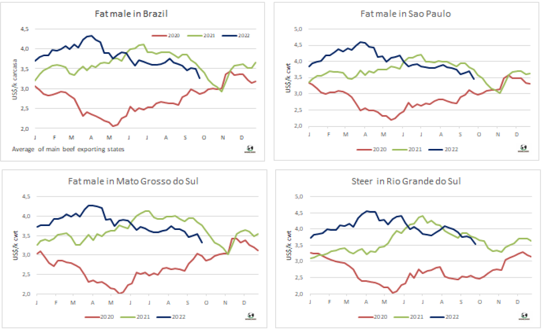 巴西待宰牛價(jià)格持續(xù)下跌。本周牛價(jià)下跌了5-6雷亞爾/15公斤。圣保羅市場(chǎng),盡管主要供應(yīng)國(guó)內(nèi)市場(chǎng)的普通育肥牛數(shù)量也有下降,獲準(zhǔn)向中國(guó)出口的30個(gè)月以下的牛數(shù)量出現(xiàn)了更明顯的下降。昨天圣保羅市場(chǎng)育肥牛參考價(jià)279雷亞爾/15公斤,免稅,30天付款,較上周下跌了6.5雷亞爾/15公斤。批發(fā)市場(chǎng)牛肉價(jià)格持續(xù)疲軟,尤其是前部位肉價(jià)格。