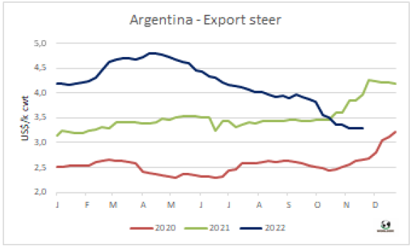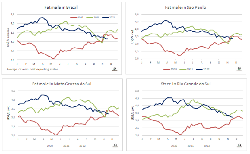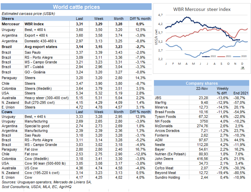 今年下半年,南美國家牛肉價(jià)格下跌,但谷物價(jià)格仍居高不下。這將導(dǎo)致南美國家減少育肥投入,從而導(dǎo)致2023年前幾個(gè)月育肥牛供應(yīng)下降。烏拉圭集約化養(yǎng)殖者協(xié)會(huì)(Aupcin)主席álvaro Ferrés告訴WBR,“有些人開始擔(dān)心2023年第一季度供應(yīng)減少。如果未來幾個(gè)月牛價(jià)上漲,育肥場的供應(yīng)狀況可能會(huì)改善,”從成本方面來看,由于動(dòng)物飼料價(jià)格仍維持在高位,且雨后預(yù)備牛價(jià)格穩(wěn)定,預(yù)計(jì)不會(huì)出現(xiàn)大幅下降??紤]到草飼牛的銷售旺盛,直到年中,以及由于缺水而導(dǎo)致的牧草狀況不佳,Ferrés認(rèn)為“必須進(jìn)行谷飼育肥才能得到成品牛?!蹦厦赖貐^(qū)其他國家情況也類似。巴西方面,根據(jù)Cepea的說法,“目前的情況不適合圍欄牧場育肥?!卑⒏⒎矫?,“飼料場的現(xiàn)狀很差,”阿根廷育肥場協(xié)會(huì)(CAF)主席Fernando Storni告訴WBR。巴拉圭方面,近幾個(gè)月來育肥牛價(jià)格的暴跌導(dǎo)致飼養(yǎng)場每頭牛虧損100至200美元,因?yàn)榧茏优5牟少弮r(jià)格非常高。作為全球牛肉的主要供應(yīng)商,南方共同市場在2023年的頭幾個(gè)月可能會(huì)出現(xiàn)供應(yīng)減少,特別是牛齡較小的育肥牛。這是一個(gè)很重要的信息,因?yàn)榘臀髦荒芟蛑袊隹谕涝讜r(shí)牛齡小于30個(gè)月的牛肉。