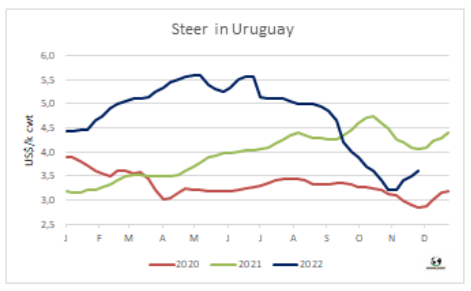 過去五周,南方共同市場待宰牛的均價(jià)基本保持穩(wěn)定,在3.28-3.31美元/公斤美元之間波動(dòng)。上周,南方共同市場閹牛價(jià)格指數(shù)上漲了2美分,至3.31美元/公斤。巴西方面育肥牛雷亞爾價(jià)格有小幅上漲,但被0.7%的匯率跌幅逆轉(zhuǎn),主要出口市場育肥牛價(jià)格下跌了1美分至3.14美元/公斤。阿根廷方面,出口閹牛美元價(jià)格上漲2美分至3.6美元/公斤。烏拉圭本周牛價(jià)繼續(xù)上漲,與阿根廷參考價(jià)相當(dāng),3.6美元/公斤。巴拉圭待宰公牛價(jià)格保持3.2美元/公斤。