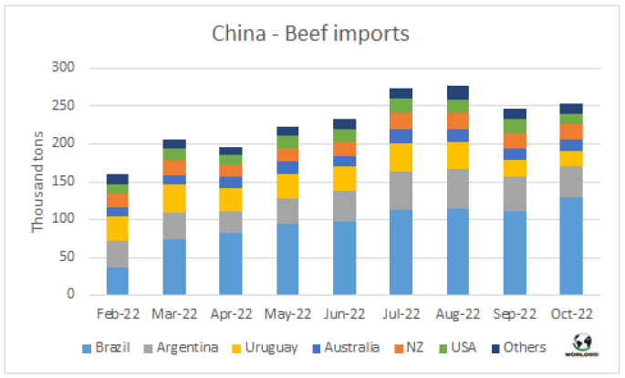 根據(jù)海關(guān)報(bào)告的數(shù)據(jù),中國10月進(jìn)口牛肉253,717噸,略高于9月5000噸,盡管低于7月和8月進(jìn)口量,7,8月進(jìn)口量超過27萬噸。10月進(jìn)口量中幾乎都是冷凍牛肉,冰鮮牛肉只有3902噸。在249,816噸冷凍牛肉中,30,689噸是帶骨牛肉,平均進(jìn)口價(jià)格為3,291美元/噸,218,666噸是去骨牛肉,平均進(jìn)口價(jià)格為6,884美元/噸。帶骨牛肉的主要供應(yīng)國是烏拉圭,約9087噸,平均價(jià)格2982美元/噸。去骨冷凍牛肉的主要供應(yīng)國是巴西,約130168噸,平均價(jià)格6,681美元/噸。此外,牛副到港量2392噸,烏拉圭也是主要供應(yīng)國,從烏拉圭進(jìn)口約781噸。盡管從澳洲出口量減少,考慮到9月和10月從南方共同市場發(fā)貨的數(shù)量,預(yù)期11月的牛肉進(jìn)口量仍然很大, 11月進(jìn)口量可能略低于10月。