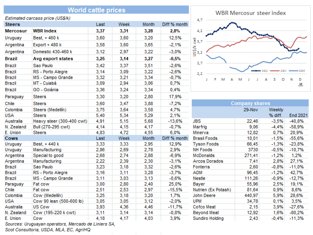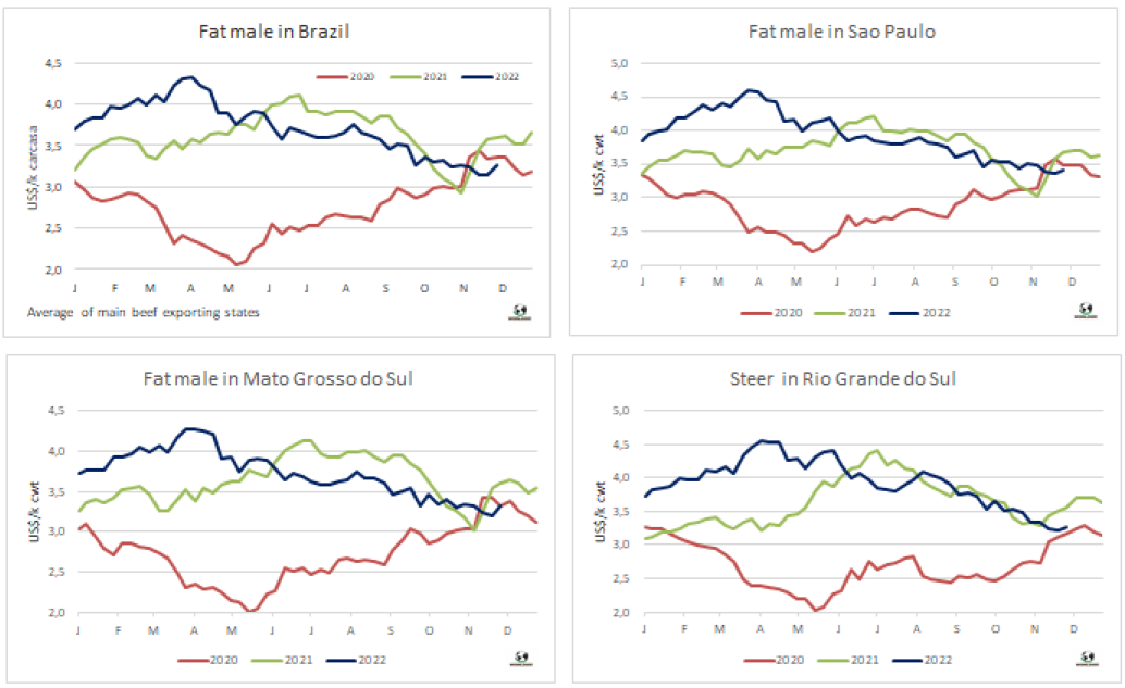 Agrifatto咨詢公司的畜牧經(jīng)理預(yù)測,隨著公牛和母牛屠宰量的同步增加,牛肉價(jià)格應(yīng)該在年末幾周下降。在馬托格羅索的一次采訪中,他說,在消費(fèi)較低的時(shí)候,市場上肉類供應(yīng)增加,這應(yīng)該會轉(zhuǎn)化為終端消費(fèi)下個(gè)的下降。農(nóng)民已經(jīng)感受到了價(jià)格的下降,與去年同期相比,育肥牛價(jià)格下降了11%,但消費(fèi)者還沒有感受到。Agrifatto預(yù)測,隨著國內(nèi)市場的供應(yīng)進(jìn)一步增加,牛肉價(jià)格的下跌將持續(xù)到2023年。