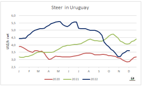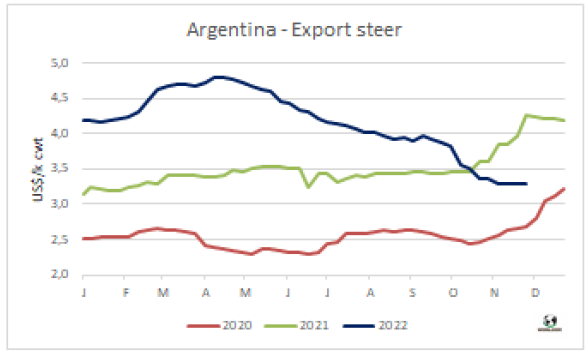 南方共同市場閹牛價(jià)格指數(shù)離開過去五周的窄幅波動(dòng)區(qū)間,本周該指數(shù)上漲了6美分,至3.37美元/公斤,主要受巴西牛價(jià)上漲的拉動(dòng)。巴西主要出口州育肥牛價(jià)格上漲11美分至3.25美元/公斤,主要因?yàn)槔讈啝杻r(jià)格上漲,以及匯率升值1.5%。巴拉圭方面,價(jià)格也有上漲,待宰閹牛價(jià)格上漲了10美分至3.3美元/公斤。阿根廷方面,出口閹牛比索價(jià)格上漲匯率下降導(dǎo)致美元價(jià)格下跌2美分至3.58美元/公斤。烏拉圭連續(xù)四周的上漲趨勢停止,本周牛價(jià)保持3.6美元/公斤。