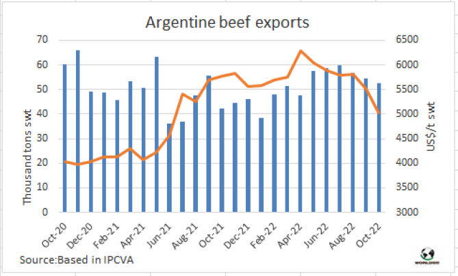 繼9月牛肉出口量下降之后,10月牛肉出口量再次下降,僅52769噸(其中8700多噸是帶肉的骨頭,價(jià)值非常低),環(huán)比減少5.8%,但比去年同期增加25.5%。出口額達(dá)2.65億美元,環(huán)比下降13.3%,同比增長9.2%。平均價(jià)格略高于5000美元/噸,是2021年年中以來的最低水平。