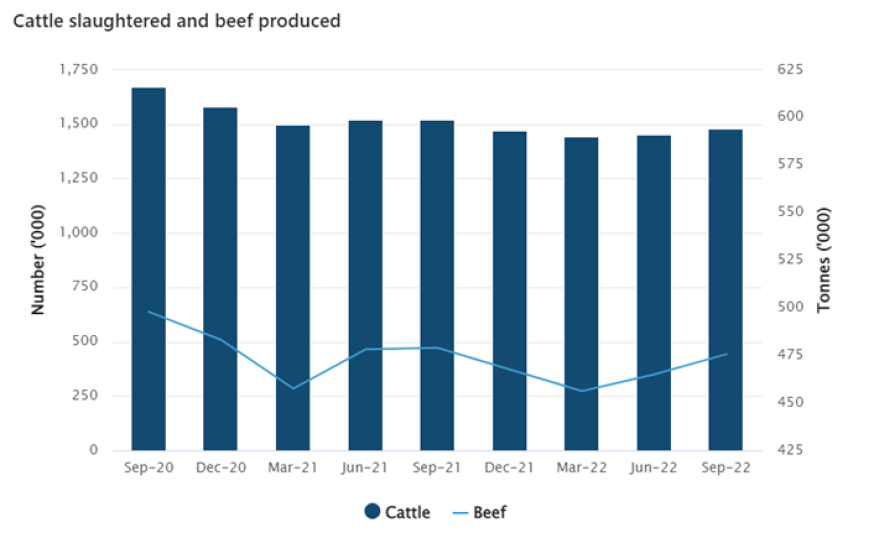 據(jù)報(bào)道,與2022年7月相比,澳大利亞在2022年9月當(dāng)季牛屠宰量增加了1.9%至150萬頭,牛肉產(chǎn)量增長了2.3%至475628噸。在年度比較中,屠宰量同比下降了2.5%,產(chǎn)量同比下降了0.7%。母牛的屠宰率達(dá)44%,這表明今年最后一個(gè)季度牛群的重建仍在繼續(xù)。另一方面,全國羊屠宰量同比增長了2%,至592萬頭,羊肉產(chǎn)量同比增長7.2%,至14.51萬噸。