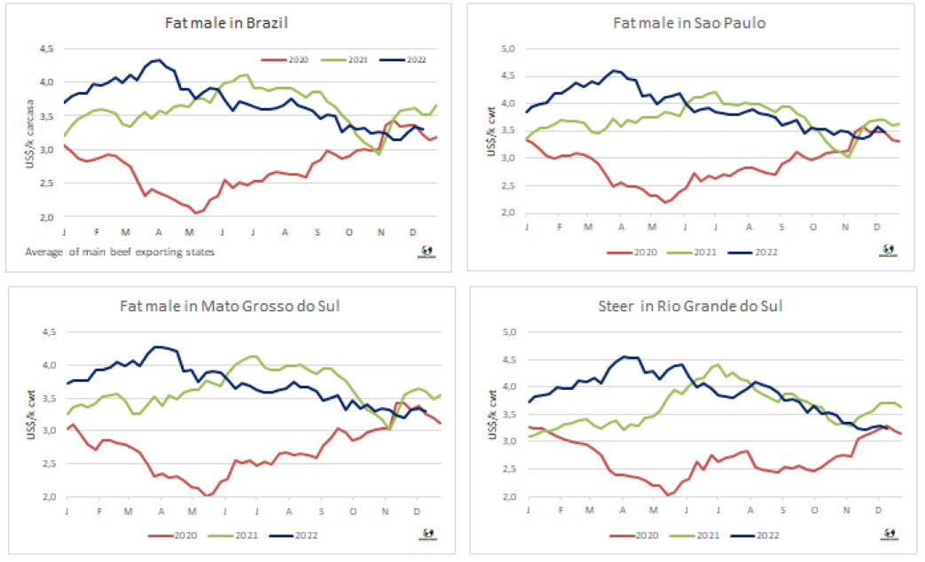 本周南方共同市場(chǎng)閹牛價(jià)格指數(shù)下跌了5美分,至3.35美元/公斤。巴西、巴拉圭、烏拉圭牛價(jià)走弱,阿根廷牛價(jià)保持穩(wěn)定。巴西主要出口州閹牛價(jià)格從上周的3.34美元/公斤下跌至3.29美元/公斤,且本周雷亞爾兌美元匯率調(diào)貶。
