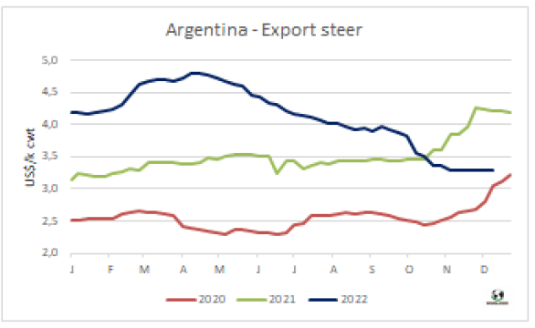 阿根廷出口閹牛價(jià)格連續(xù)四周反彈之后,結(jié)束了上漲趨勢(shì)。這最好的出口閹牛價(jià)格報(bào)價(jià)550-560比索/公斤,本地和澤布雜交牛530-540比索/公斤。特優(yōu)和良種母牛價(jià)格仍在490-500比索/公斤,主要賣(mài)到中國(guó)市場(chǎng)的工業(yè)母牛價(jià)格370-430比索/公斤。