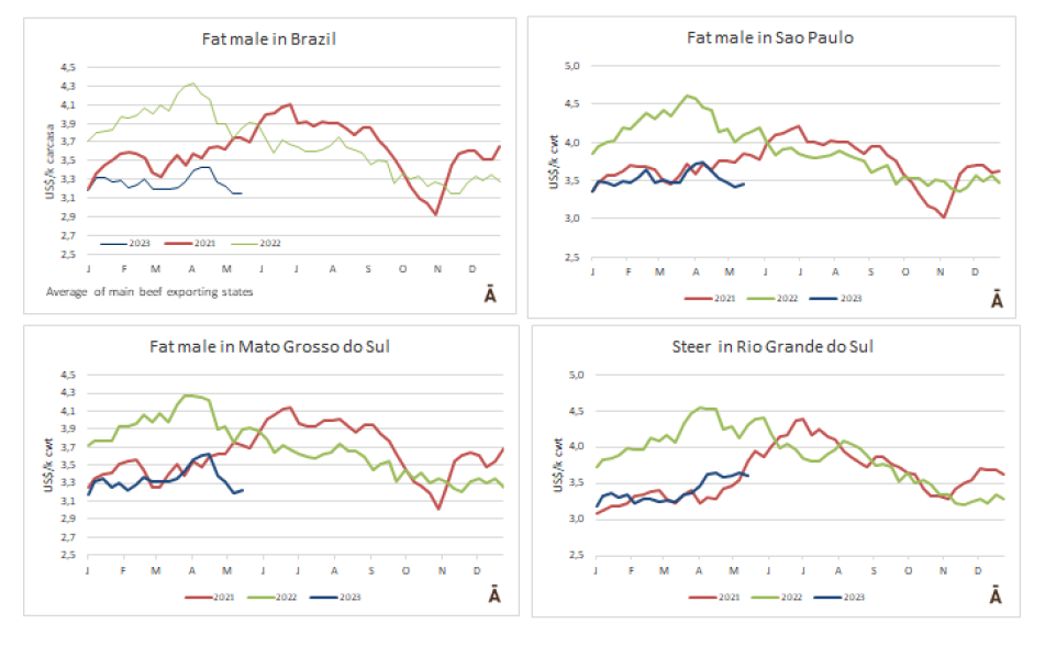 本周開(kāi)始,圣保羅的肥牛價(jià)格所有下降,但在周末時(shí)穩(wěn)定下來(lái)。目前的情況是供應(yīng)良好,商家不多但屠宰量穩(wěn)定。