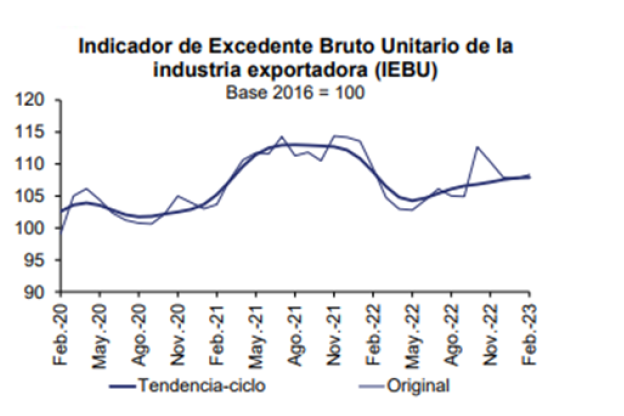 就其本身而言,衡量出口行業(yè)盈利能力的單位總盈余指標(biāo)在最近幾個(gè)月顯示出輕微的增長(zhǎng),此前在10月份觀察到的大幅增長(zhǎng)。在2023年的前兩個(gè)月,該指標(biāo)比一年前觀察到的指標(biāo)低3%,據(jù)數(shù)據(jù)顯示,這是由于出口價(jià)格的輕微增長(zhǎng)被成本的增加所抵消產(chǎn)生的