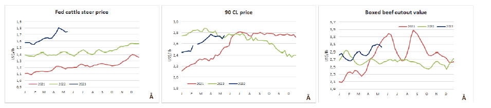 4月有117萬(wàn)頭牛被屠宰,這一數(shù)字比3月低9%,比2022年4月高11%。按營(yíng)業(yè)日計(jì)算,4月份的屠宰量達(dá)到每天65,100頭牛,比上個(gè)月高10.6%,比一年前高17.6%。而且,根據(jù)ABC出口商商會(huì)的說(shuō)法,這至少是過(guò)去四年來(lái)的最高值。