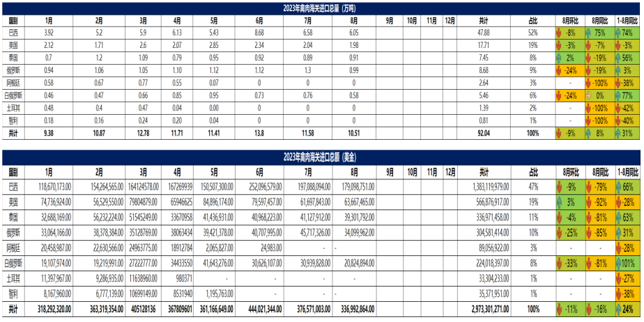 2023年8月冷凍豬牛禽肉海關進口數(shù)據(jù)