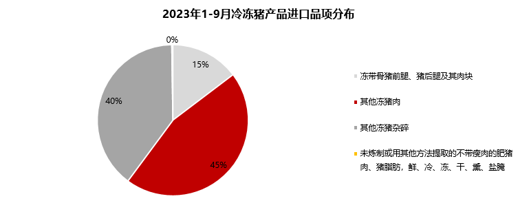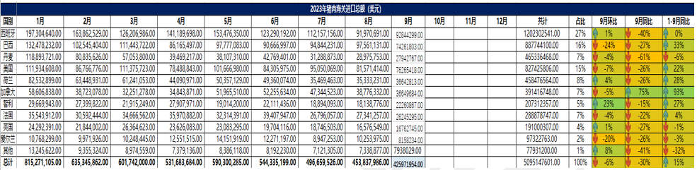 2023 年 9月中國主港豬肉進口量 20.22 萬噸,環(huán)比上漲1%,同比減少 16%。1-9 月主 港豬肉進口量 210.64 萬噸,同比增加 6%。從進口國別看,其中,從西班牙進口豬肉共計 47.7 萬噸,同比減少 6.3%,占比 23%。從美國進口豬肉共計 34.48 萬噸,同比增加 25%,占比 16%。從巴西進口豬肉共計33.91 萬噸,同比增加 15%,占比 16%。從丹麥進口豬肉共計 19.09萬噸,同比減少20%。從進口品項看,1-9月,凍帶骨豬前腿、豬后腿及其肉塊進口量 30.95萬噸,占比 15%。其他凍豬肉進口量95.72萬噸,占比 45%。其他凍豬雜碎 83.44 萬噸,占比 40%。豬油脂類進口量僅 0.49 萬噸。從 進口金額看,1-9 月,主港豬肉進口總額 50.95 億美金,同比上漲 15%。其中,進口西班牙 豬肉金額 12.02 億美金,同比持平。進口巴西豬肉金額 8.88億美金,同比上漲 33%。進口美國豬肉金額 8.27 億美金,同比上漲 22%。進口丹麥豬肉金額 4.65億美金,同比減少6%。
