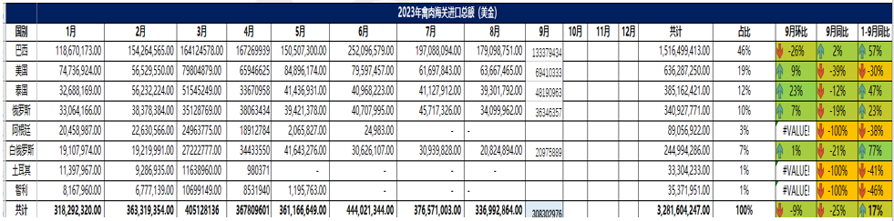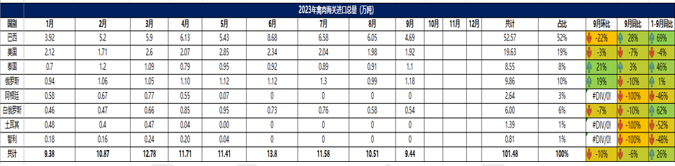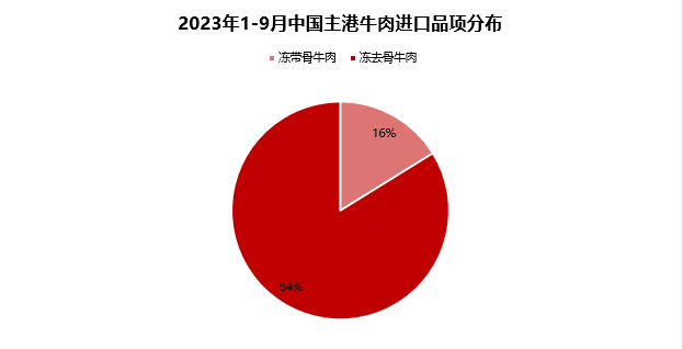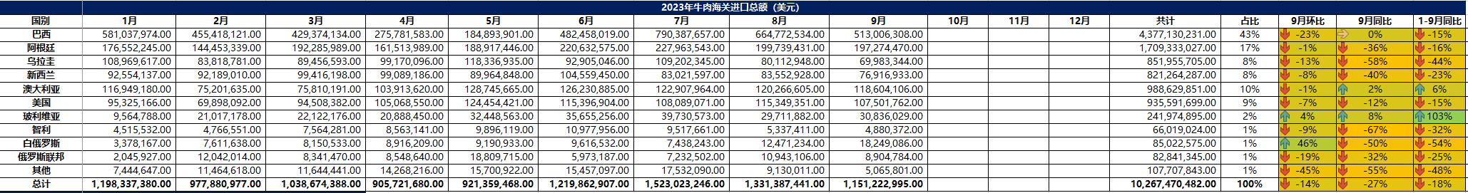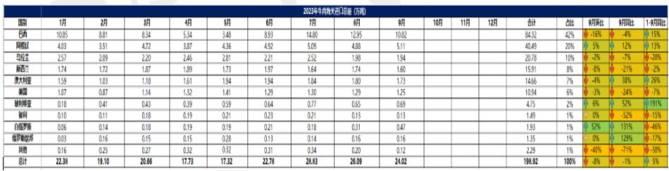 2023 年 9 月中國主港牛肉進口量 24.02萬噸,環(huán)比減少 8%,同比減少 1%。1-9 月, 中國主港牛肉進口總量 198.92 萬噸,同比增加 5%。從進口國別看,進口巴西牛肉 84.32 萬 噸,同比增加 15%,占比 42%。進口阿根廷牛肉40.49萬噸,同比增加 13%,占比 20%。 進口烏拉圭牛肉 20.78萬噸,同比減少 28%,占比 10%。進口新西蘭牛肉 15.91萬噸,同比下降2%,占比 8%。進口澳大利亞牛肉 14.66 萬噸,同比增加 26%,占比 7%。從進口品 項看,凍去骨牛肉進口總量 166.73 萬噸,占比 84%。凍帶骨牛肉進口總量 32.18萬噸,占比 16%。從進口金額看,1-9 月,中國主港牛肉進口金額共計 102.67億美金,同比減少 18%。 其中,巴西牛肉進口金額 43.77 億美金,同比減少 15%。阿根廷牛肉進口金額 17.09億美金, 同比減少 16%。澳大利亞牛肉進口金額9.89億美金,同比增加 6%。烏拉圭牛肉進口金額 8.51 億美金,同比減少 44%。新西蘭牛肉進口金額8.21億美金,同比減少23%。