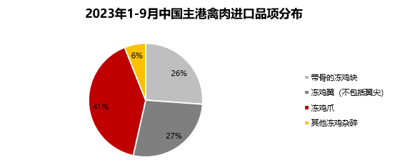 2023 年 9 月中國主港禽肉進口量 9.44 萬噸,環(huán)比減少 10%,同比減少6%。1-9月,中 國主港禽肉進口量101.48萬噸,同比增加 26%。從進口國別看,進口巴西禽肉共計 52.57萬 噸,同比增加 69%,占比 52%。進口美國禽肉 19.63萬噸,同比減少 4%,占比 19%。進口 俄羅斯禽肉 9.86萬噸,同比增加1%,占比 10%。進口泰國禽肉 8.55 萬噸,同比增加46%,占比 8%。從進口品項看,帶骨凍雞塊進口量26.56萬噸,占比 26%。凍雞翼(不包括翼尖) 27.75 萬噸,占比 27%。凍雞爪進口量41.10萬噸,占比 41%。其他凍雞雜碎進口量 6.09 萬噸,占比 6%。從進口金額看,1-9月,中國主港雞肉進口金額共計 32.81億美金,同比增 加 17%。其中,巴西禽肉進口金額 15.16億美金,同比增加57%。美國禽肉進口金額 6.36 億美金,同比下滑 30%。泰國禽肉進口金額3.85億美元,同比增加 47%。俄羅斯禽肉進口金額 3.41億美金,同比增加23%。白俄羅斯禽肉進口金額 2.45 億美金,同比增77%。