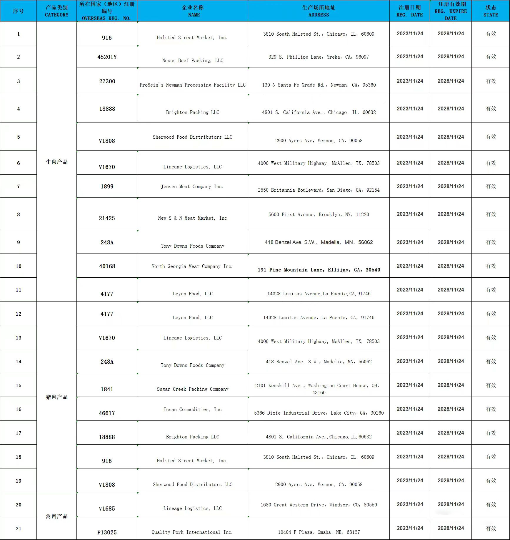 符合評估審查要求的國家或地區(qū)輸華肉類產(chǎn)品名單(2023年11月24日更新)