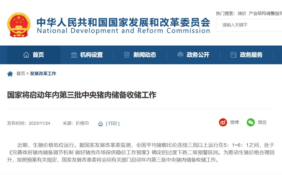 近期,生豬價(jià)格低位運(yùn)行。據(jù)國(guó)家發(fā)展改革委監(jiān)測(cè),全國(guó)平均豬糧比價(jià)連續(xù)三周以上運(yùn)行在5:1~6:1之間,處于《完善政府豬肉儲(chǔ)備調(diào)節(jié)機(jī)制 做好豬肉市場(chǎng)保供穩(wěn)價(jià)工作預(yù)案》確定的過(guò)度下跌二級(jí)預(yù)警區(qū)間。為推動(dòng)生豬價(jià)格合理回升,按照預(yù)案有關(guān)規(guī)定,國(guó)家發(fā)展改革委將會(huì)同有關(guān)部門(mén)啟動(dòng)年內(nèi)第三批中央豬肉儲(chǔ)備收儲(chǔ)工作。