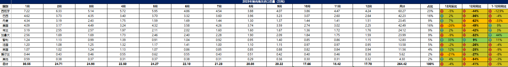 2023 年 12月中國(guó)主港豬肉進(jìn)口量17.7萬(wàn)噸,環(huán)比下降4%,同比減少41%。1-12月主港豬肉進(jìn)口量 264.42萬(wàn)噸,同比下降5%。從進(jìn)口國(guó)別看,其中,從西班牙進(jìn)口豬肉共計(jì)60.27萬(wàn)噸,同比減少12.9%,占比 23%。從美國(guó)進(jìn)口豬肉共計(jì)42.49萬(wàn)噸,同比增加9%,占比 9%。從巴西進(jìn)口豬肉共計(jì)42.23萬(wàn)噸,同比持平,占比 16%。從丹麥進(jìn)口豬肉共計(jì) 23.45萬(wàn)噸,同比減少33%。從進(jìn)口品項(xiàng)看,1-12月,凍帶骨豬前腿、豬后腿及其肉塊進(jìn)口量 36.41萬(wàn)噸,占比 14%。其他凍豬肉進(jìn)口量117.62萬(wàn)噸,占比 45%。其他凍豬雜碎109.6萬(wàn)噸,占比 41%。豬油脂類(lèi)進(jìn)口量?jī)H 0.78萬(wàn)噸。從 進(jìn)口金額看,1-12月,主港豬肉進(jìn)口總額 62.35億美金,同比下降 5%。其中,進(jìn)口西班牙 豬肉金額 14.8億美金,同比下降12%。進(jìn)口巴西豬肉金額10.77億美金,同比持平。進(jìn)口美國(guó)豬肉金額 10.04億美金,同比上漲27%。進(jìn)口丹麥豬肉金額 5.56億美金,同比減少44%。