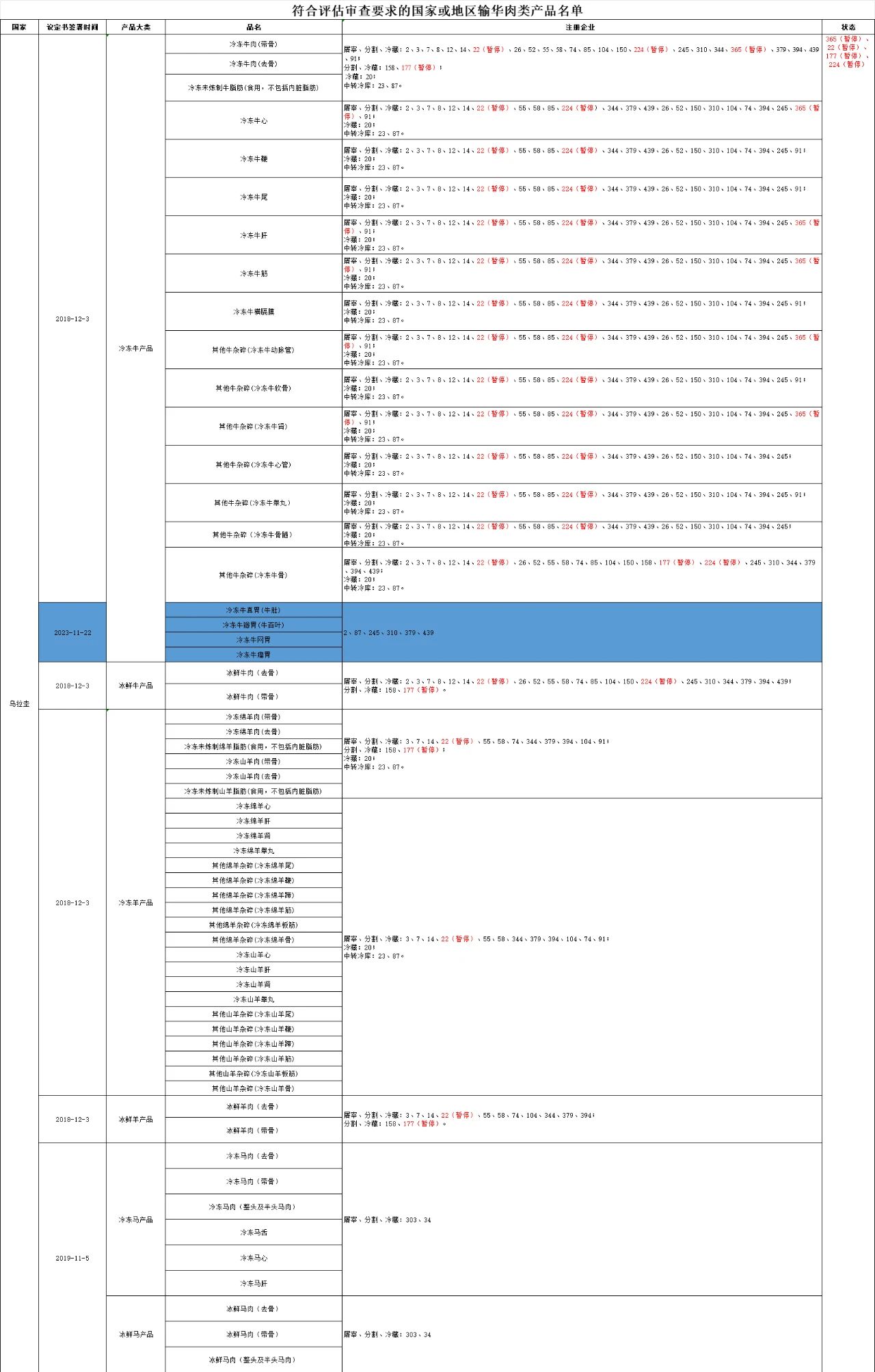 符合評(píng)估審查要求的國(guó)家或地區(qū)輸華肉類產(chǎn)品名單(2024年5月9日)(新增烏拉圭6家牛肉產(chǎn)品企業(yè))
