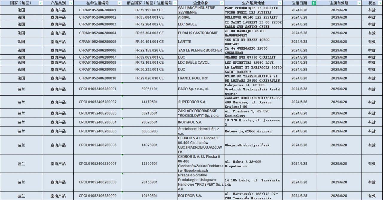 輸華肉類產(chǎn)品名錄更新2024年6月11日/28日(新增肉類產(chǎn)品企業(yè))