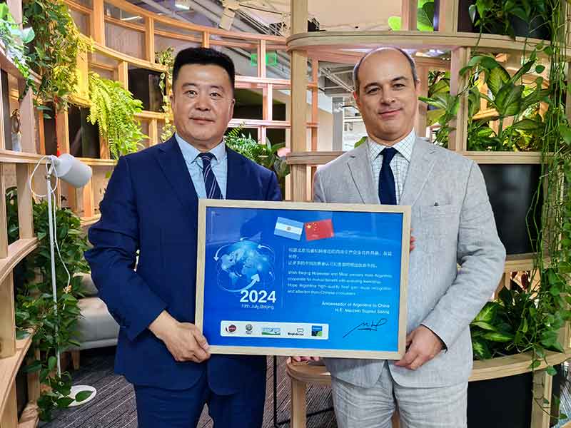 另外,阿根廷駐華大使對中國牛肉消費(fèi)市場表示關(guān)切,就消費(fèi)者是否知道我司牛肉產(chǎn)品的產(chǎn)地等問題進(jìn)行詢問。大使就阿根廷乃至南美的農(nóng)業(yè)市場情況與我司進(jìn)行溝通,提出阿根廷的乳制品市場也有巨大的開發(fā)空間,孫總也積極表示愿意提供幫助。