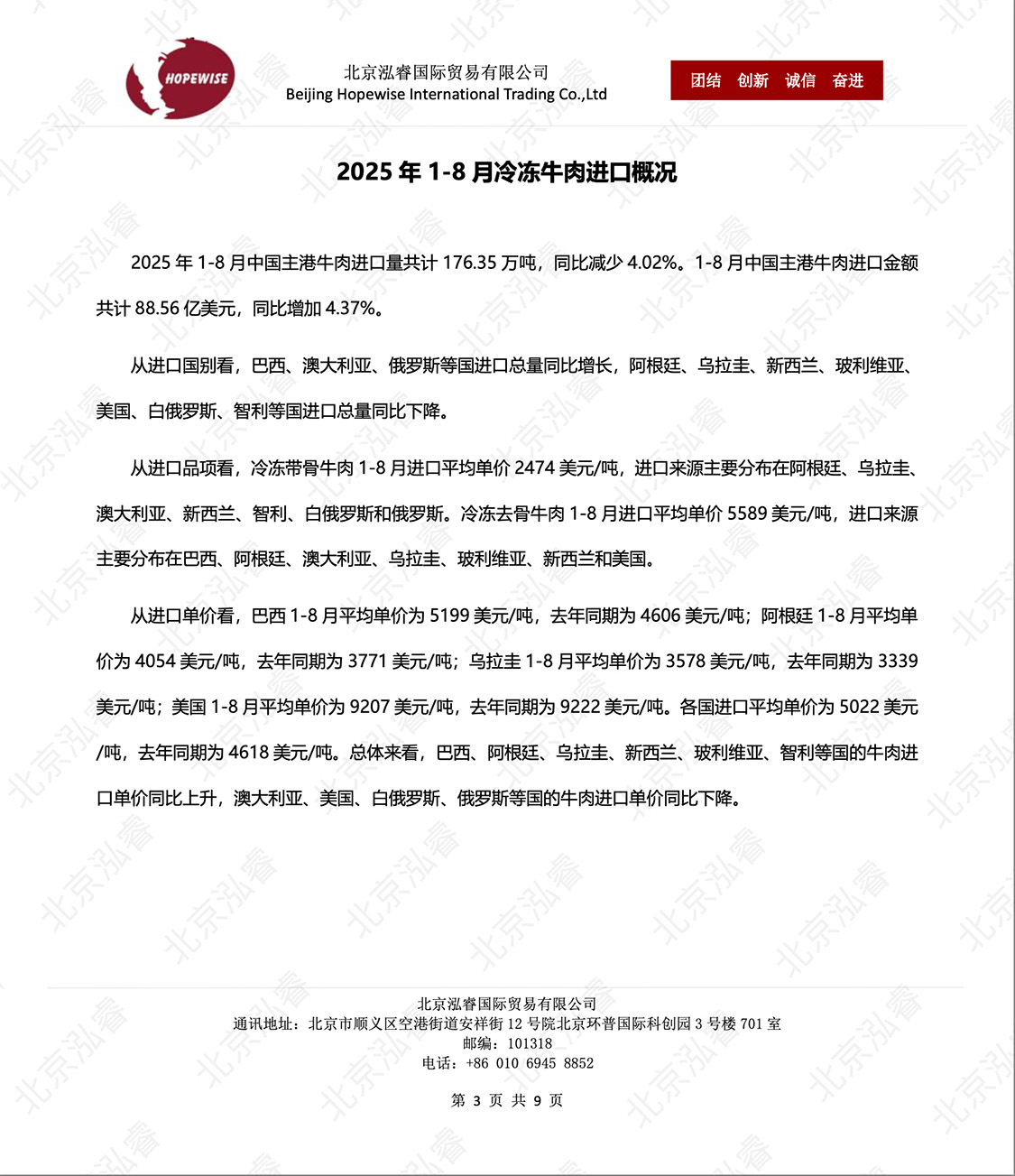 2025 年 1-8 月冷凍豬肉進(jìn)口概況