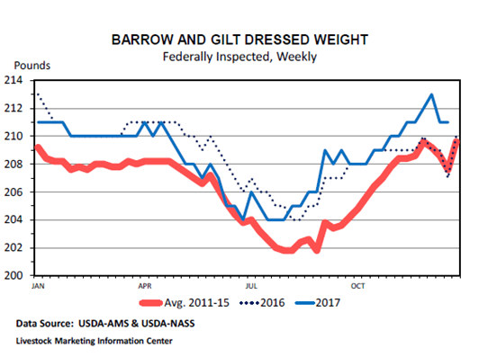 2017年生豬屠宰量依然跟隨著季節(jié)性模式。在2017第四季度年同比增加也是通常的典型情況,并高于同期前幾個(gè)月水平。11月和12月上半月溫和的中西部天氣能有利于提高育肥重量。生豬重量在2016年年底出現(xiàn)異常,年同比并沒有增加(或者說(shuō)是相較于前5年的平均水平也沒有增加,請(qǐng)見圖表)。