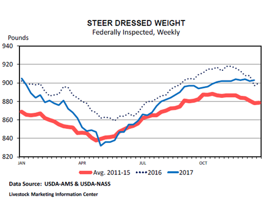 具體到昨日美國(guó)國(guó)家農(nóng)業(yè)部農(nóng)業(yè)市場(chǎng)分析中心網(wǎng)站上發(fā)布的胴體重量的具體詳細(xì)數(shù)據(jù)(數(shù)據(jù)截至到12月23日這周周末)。由于不同的育肥體系,與生豬相比育肥牛的重量更容易受冬季季節(jié)情況的影響。最重要的是,生豬幾乎是在相對(duì)控制的室內(nèi)環(huán)境下飼養(yǎng),然而美國(guó)的絕大多數(shù)育肥牛都是在室外圈養(yǎng)。在冬季的寒冷天氣是牛育肥重量下降的一個(gè)因素,而夏季炎熱的天氣往往也會(huì)使屠宰的生豬重量下降。