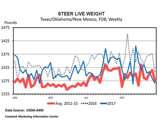 根據(jù)最新數(shù)據(jù),牛的育肥重量在2016年最終有一次上浮,部分原因是從11月到12月溫和的天氣。作為提醒(在今天日?qǐng)?bào)里的一個(gè)部分也提及到),2017年年初育肥牛的重量年同比下降不能都?xì)w結(jié)為惡劣的天氣。積極擴(kuò)張的市場(chǎng)營(yíng)銷也導(dǎo)致了這些下跌。但12月底幾個(gè)主要育肥場(chǎng)的所在地區(qū)天氣發(fā)生改變,極度寒冷的天氣突然到達(dá)美國(guó)中西部和一些其它地區(qū)。后附兩張育肥牛重量趨勢(shì)圖片相比, 顯然12月的年同比重量增加主要是在中西部和中部平原地區(qū)。近期極端寒冷的天氣主要集中在美國(guó)中部,預(yù)計(jì)國(guó)家育肥牛重量數(shù)據(jù)能很快體現(xiàn)出來(lái)。