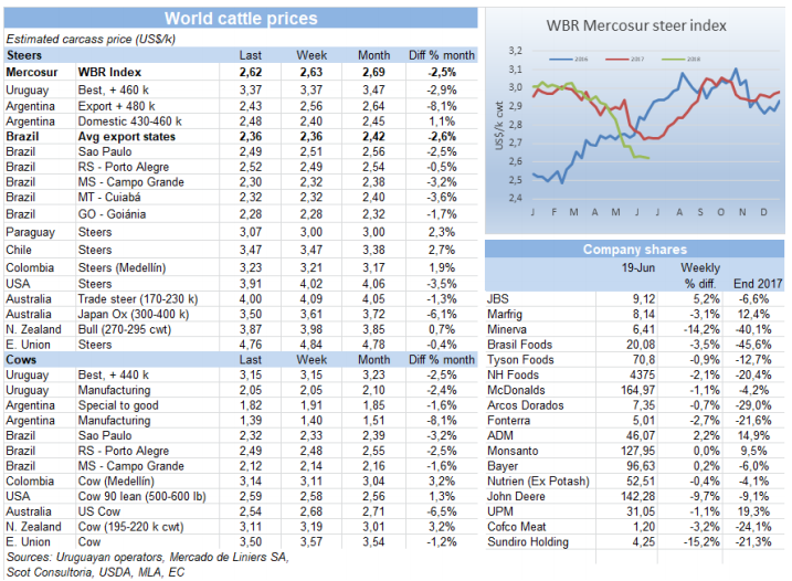 巴西市場育肥牛價(jià)格比較混亂,所有屠宰場都想壓價(jià),但是活牛供應(yīng)減少使某些州牛價(jià)反而開始上漲。跟往常一樣,本季活牛供應(yīng)開始降低,同時(shí)國內(nèi)市場牛肉庫存也在減少,但消費(fèi)市場也沒有什么需求,所以牛價(jià)近期上漲比較困難,圣保羅州牛價(jià)保持在140雷亞爾,與上周持平,已經(jīng)連續(xù)五周價(jià)格保持穩(wěn)定,但其他一些州牛價(jià)微漲。前文提到的對(duì)JBS腐敗調(diào)查可能會(huì)影響市場走勢,增加不確定因素。