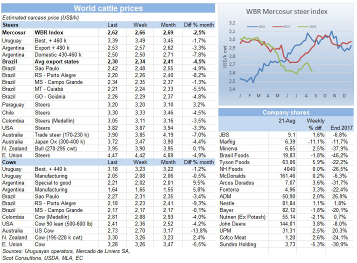 當(dāng)?shù)刎泿抛呷醭掷m(xù)影響活牛價(jià)格,以本地貨幣成交活牛的國(guó)家競(jìng)爭(zhēng)力增強(qiáng),南美共同市場(chǎng)閹牛指數(shù)本周又下跌了4美分到2.62美金/公斤,7月初以來(lái)最低。巴西雷亞爾對(duì)美金貶值了2.4%,阿根廷比索對(duì)美金貶值了1.2%,所以兩國(guó)美金牛價(jià)都下跌了4美分,巴西2.3美金/公斤,阿根廷2.53美金/公斤,烏拉圭市場(chǎng)形勢(shì)有所改變,猶太市場(chǎng)暫停,專注于481配額的谷飼牛肉生產(chǎn),巴拉圭牛價(jià)和上周一樣沒(méi)有變化。